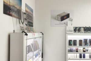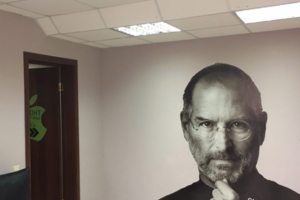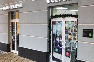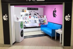 IVEstore по адресу: Окская улица, 3к1 имеет общий вход с салоном красоты и заметен издалека за счет зеленого яблока на фасаде и соответствующей вывеске